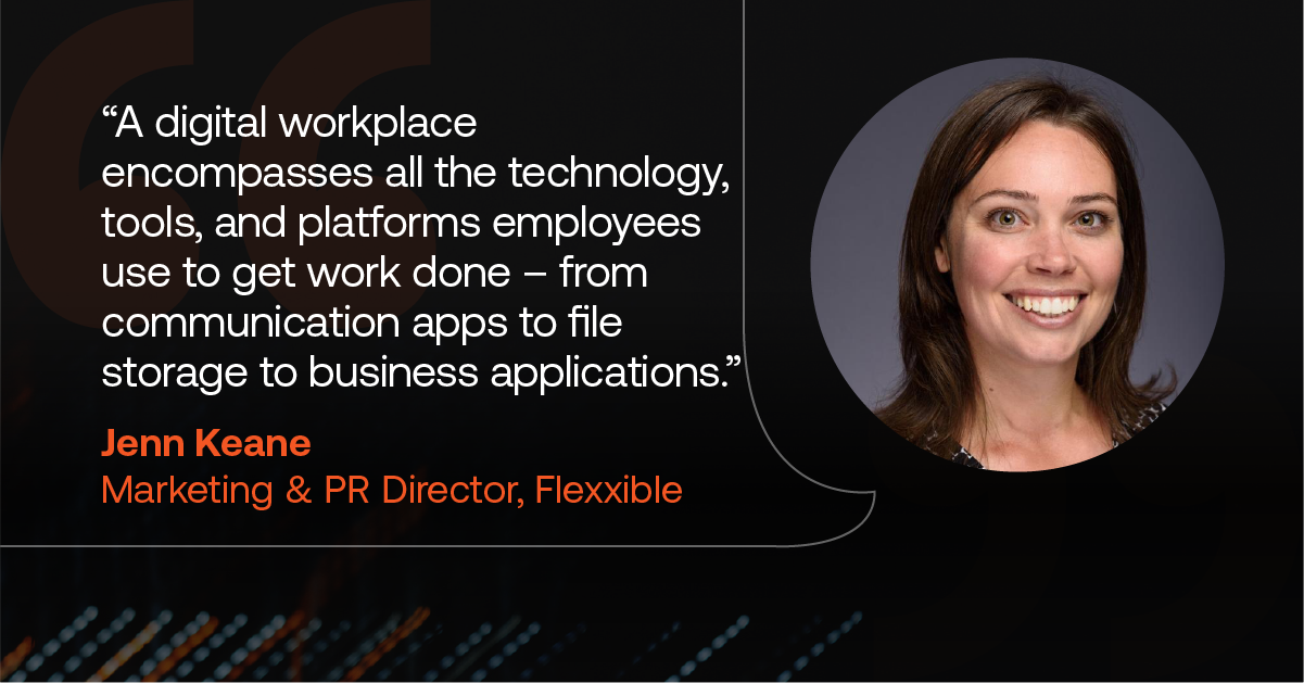 “A digital workplace encompasses all the technology, tools, and platforms employees use to get work done – from communication apps to file storage to business applications,” says Jenn Keane, Marketing and PR director at Flexxible.