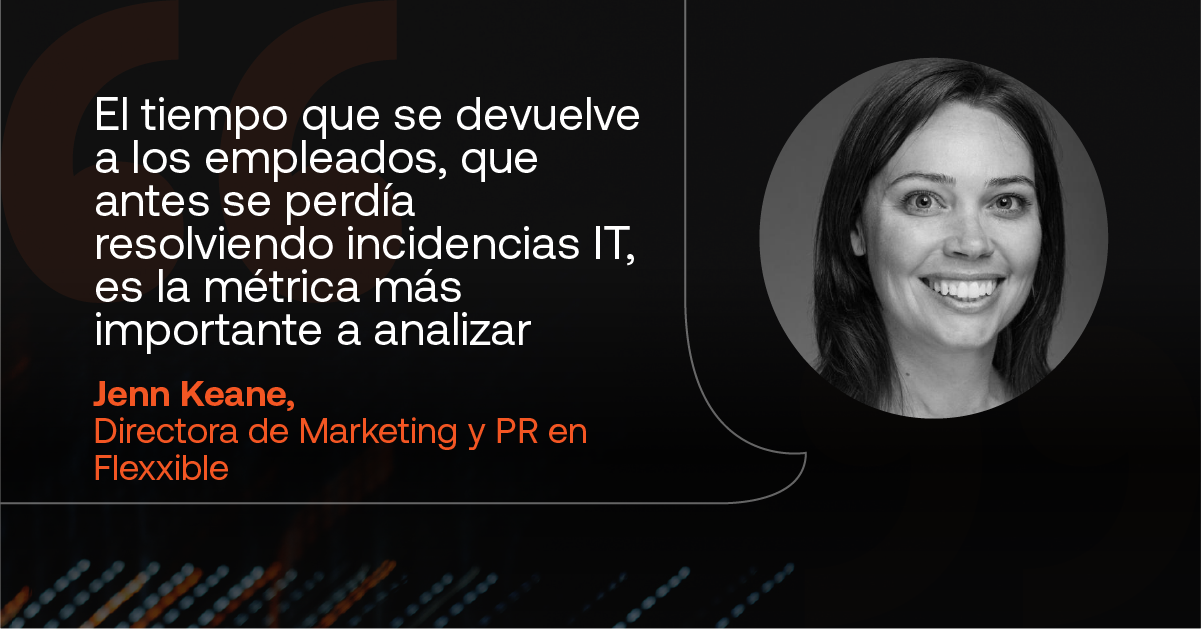 “El tiempo que se devuelve a los empleados, que antes se perdía resolviendo incidencias de IT, es la métrica más importante a analizar”, afirma Jenn Keane, Directora de marketing y PR en Flexxible. “Esta métrica afecta a toda la organización y tiene un impacto directo en la productividad”.